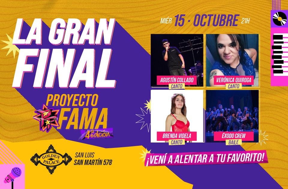 Después de semanas de talento, emoción y shows inolvidables, Proyecto Fama llega a su gran final este miércoles 15 de octubre a las 21 h en el escenario de Golden Palace San Luis.